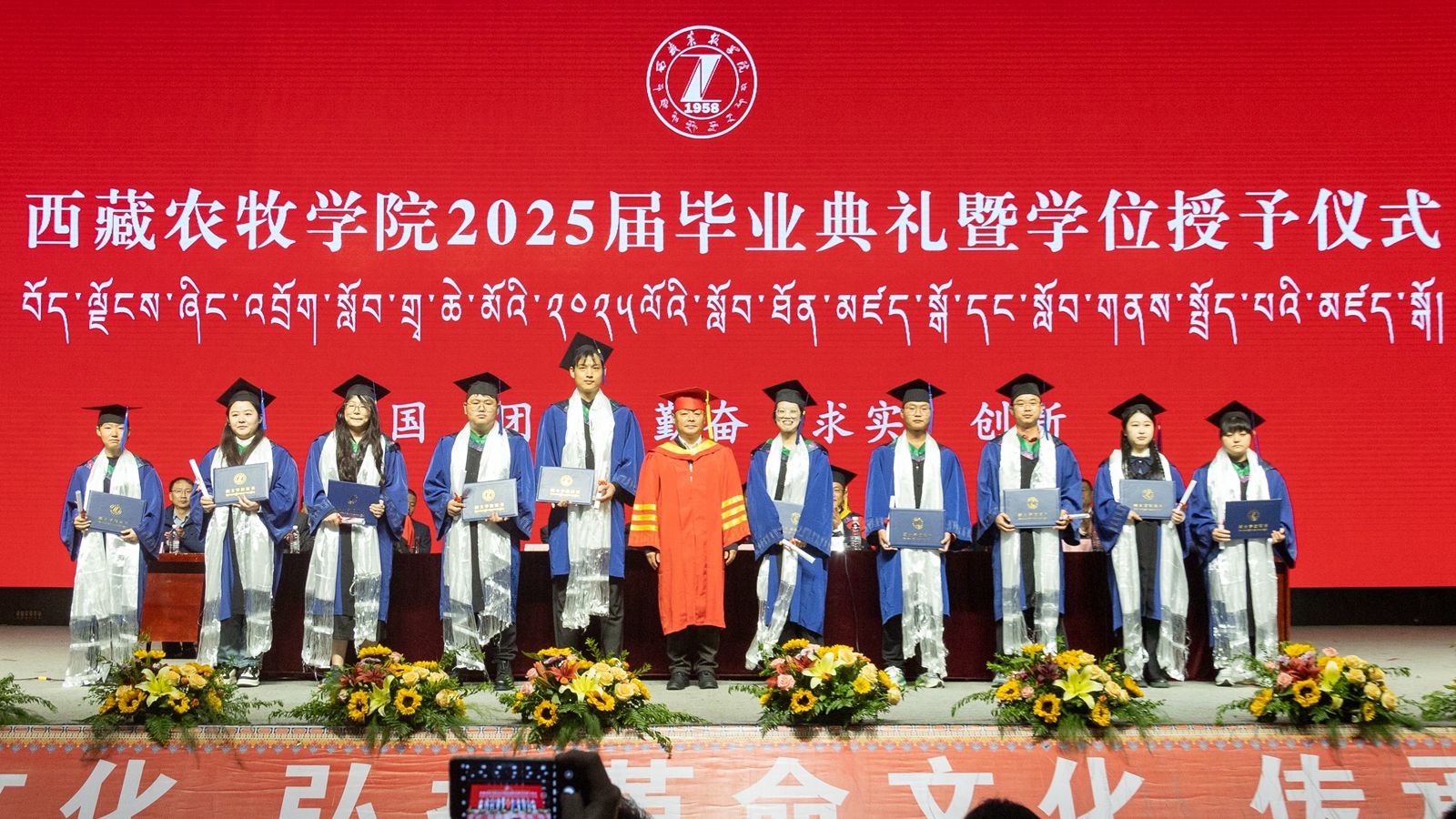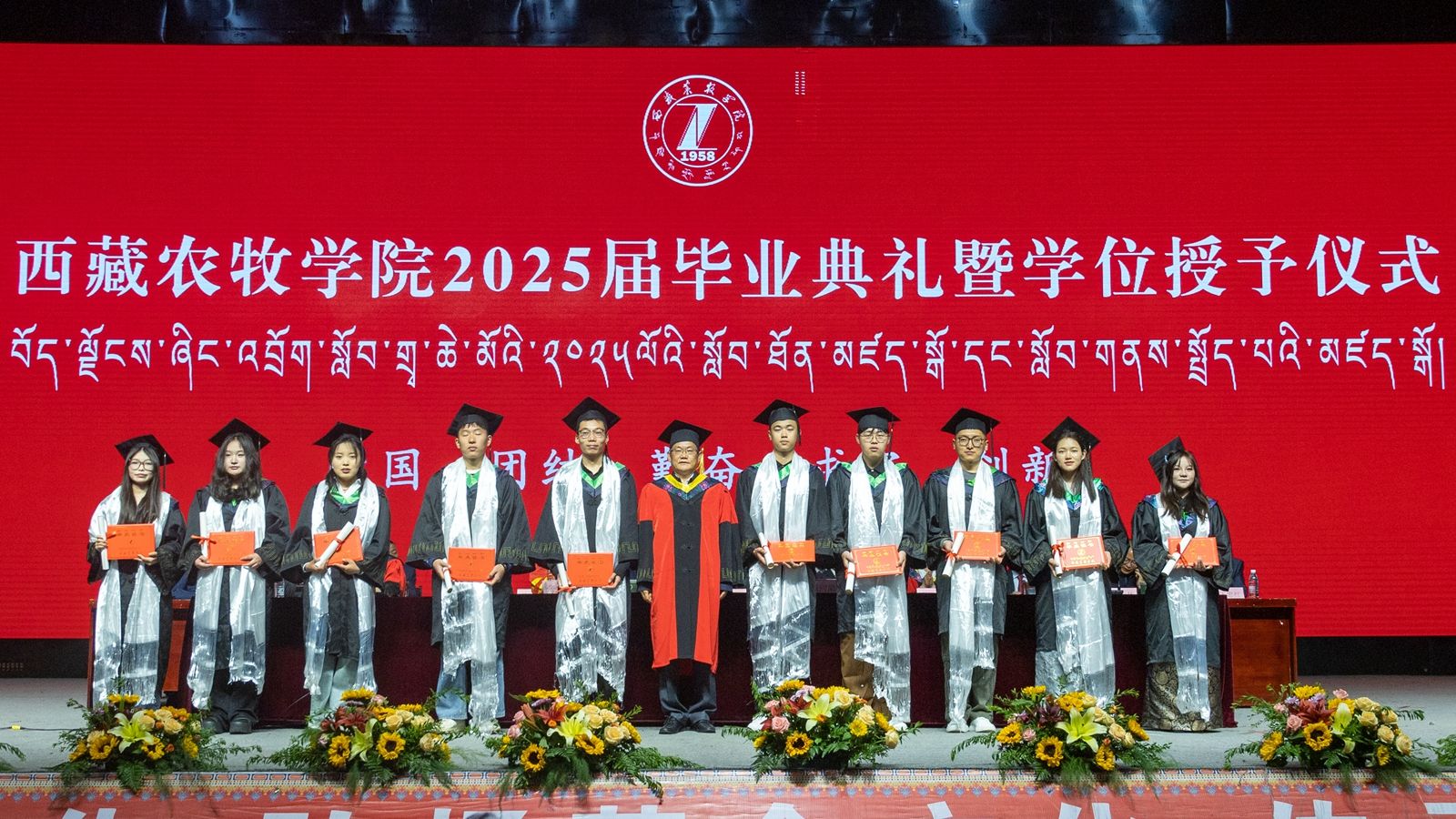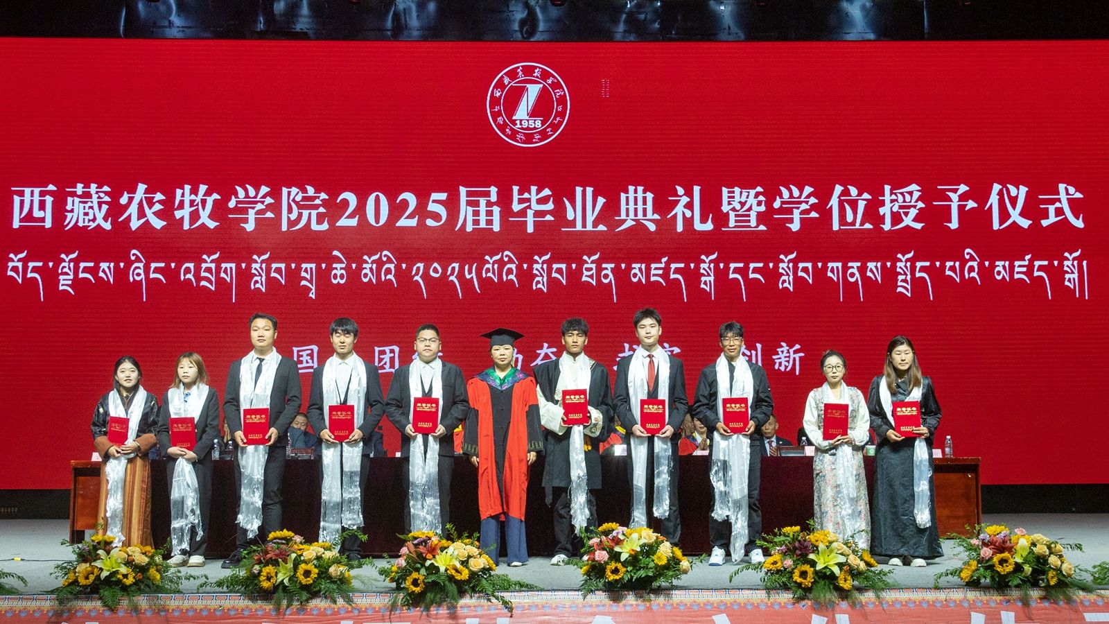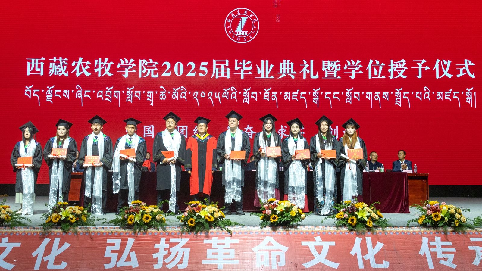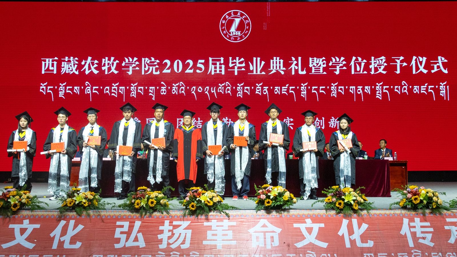 6月16日上午,西藏农牧学院2025届毕业典礼暨学位授予仪式在校文体馆举行。学校党委书记、副校长张兴堂,校党委委员、副校长巩同梁,校党委委员、副校长曹仲华,校党委委员、副校长邢震以及各职能部门、二级学院(部、所)负责人及教师代表、毕业生代表和在校生代表等1200余人共同见证和庆祝1810名本科生和275名研究生顺利毕业。