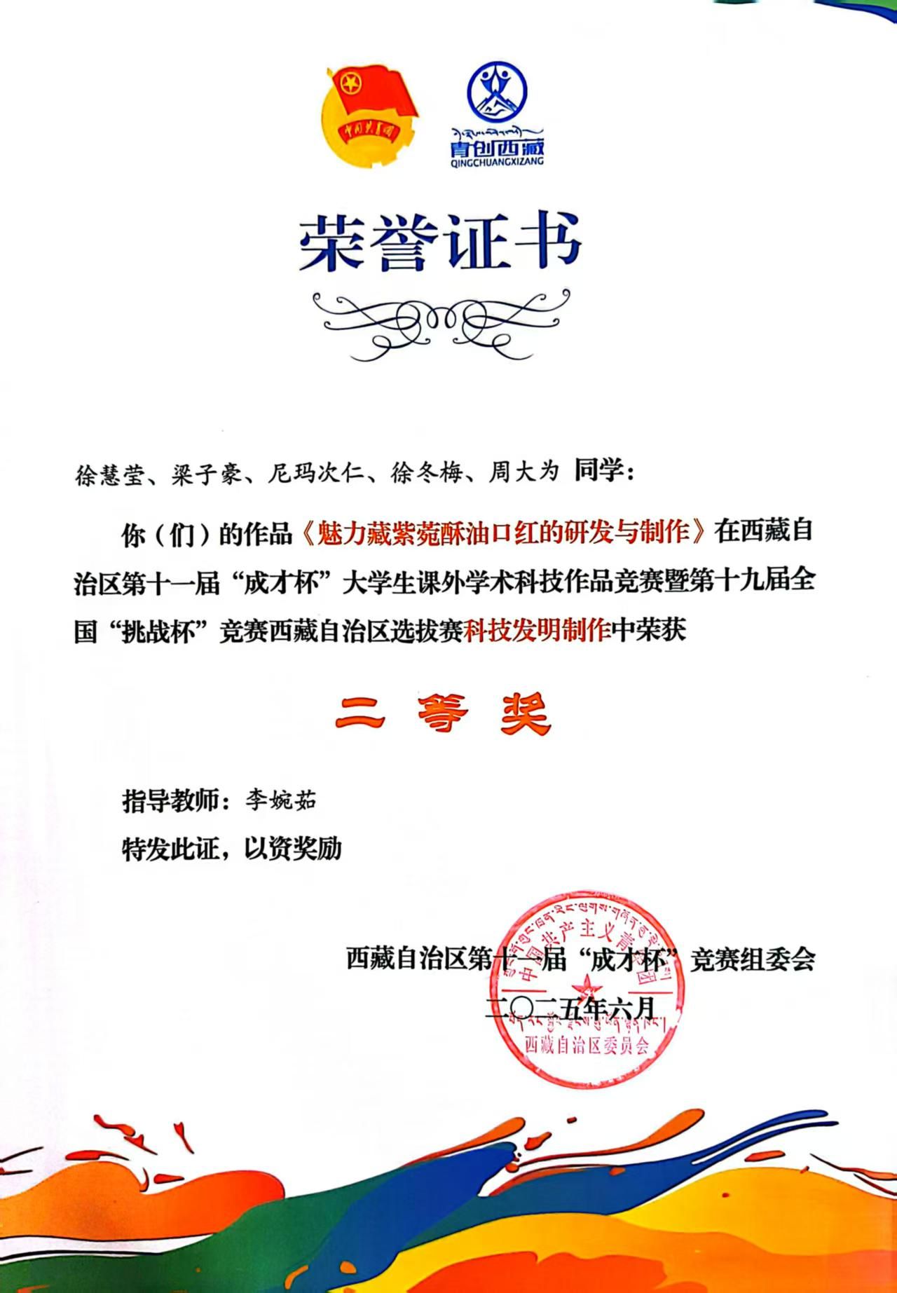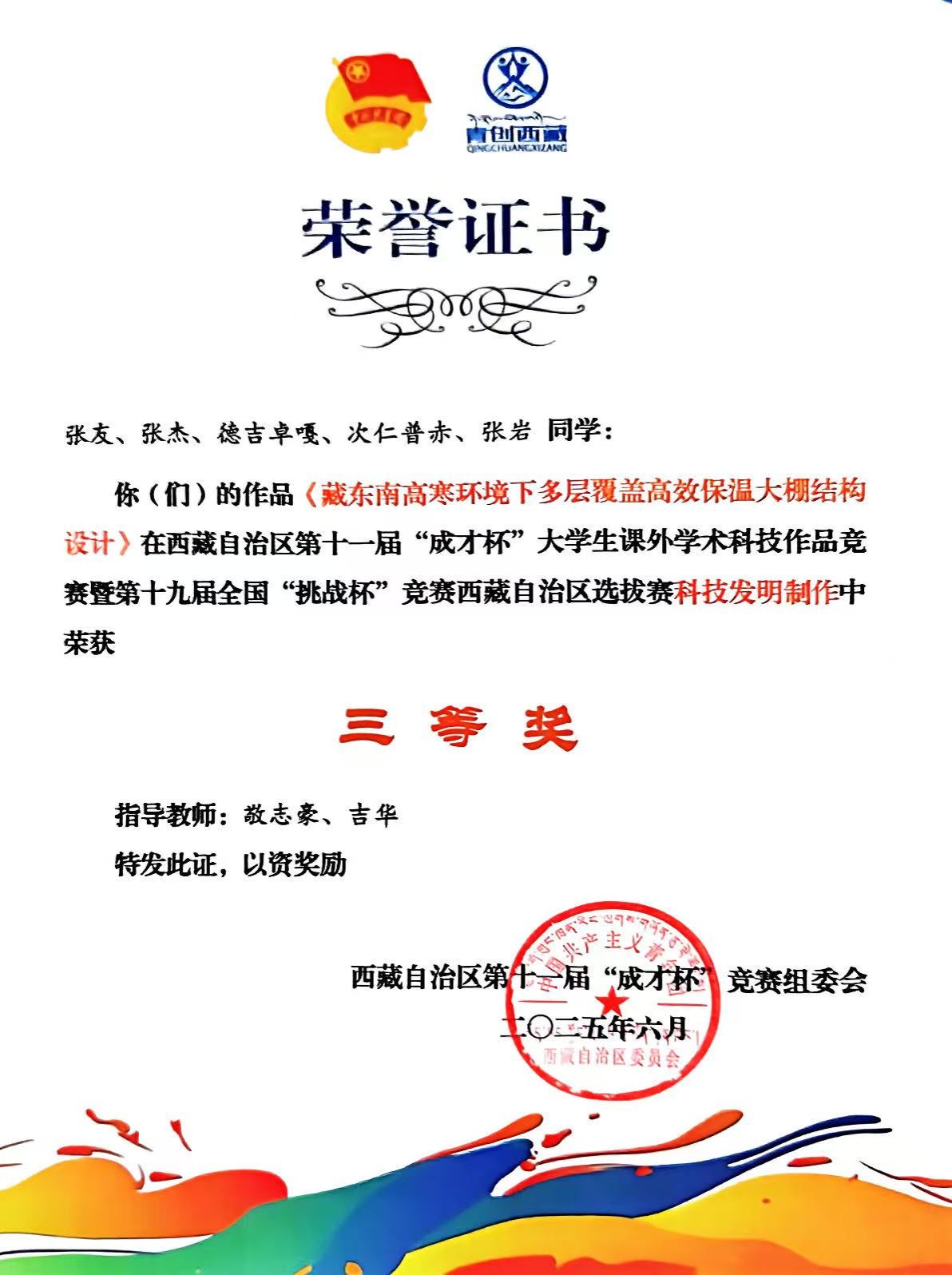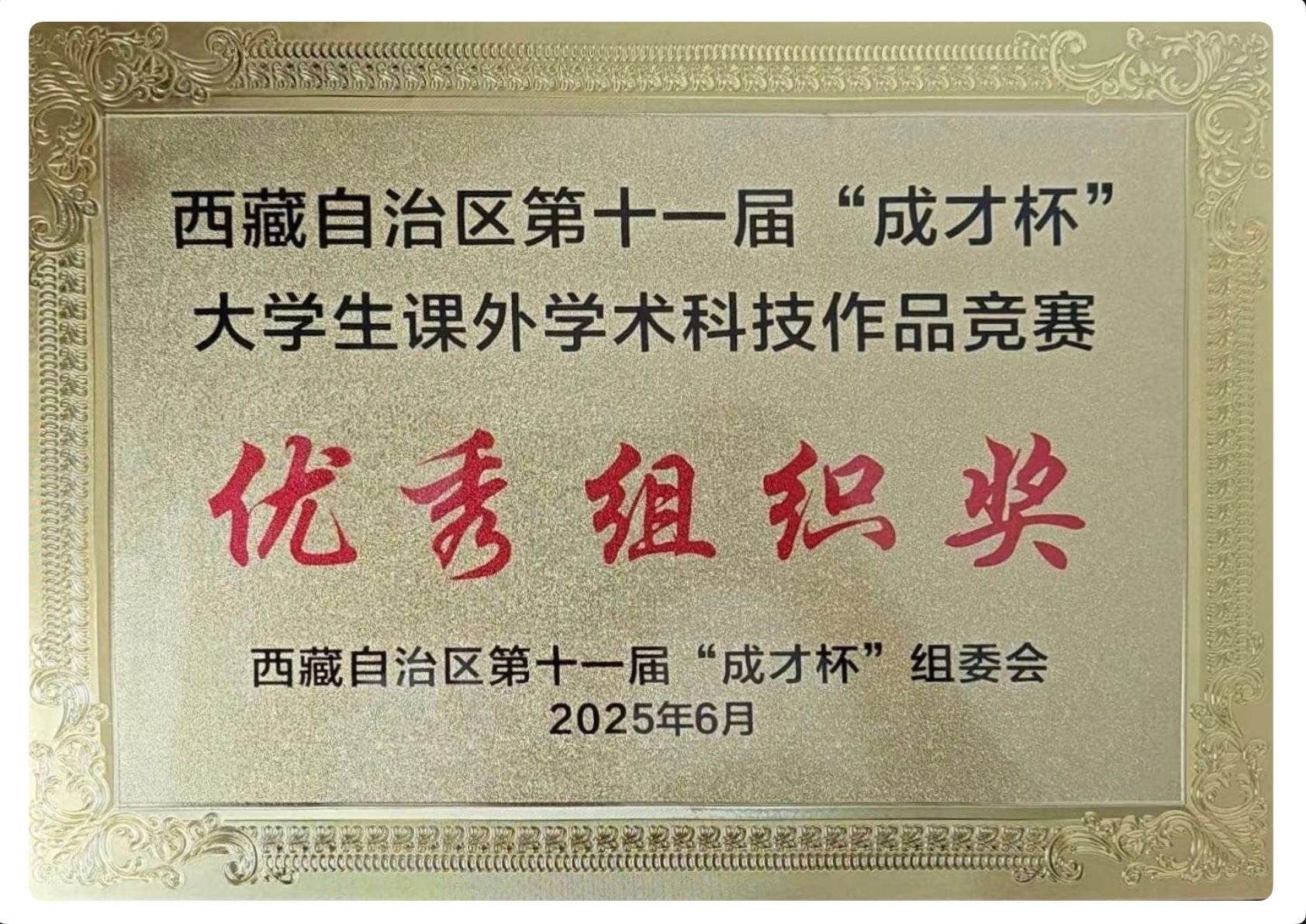 近日获悉,我校在西藏自治区第十一届“成才杯”大学生课外学术科技作品竞赛暨第十九届全国“挑战杯”竞赛西藏自治区选拔赛决赛中取得优异成绩!大赛由团西藏区委、区教育厅、区科技厅、区人社厅、区工商联、区科协、区社科院、区学联联合主办。在本次竞赛中,我校入围区赛的11个参赛团队凭借卓越的创新思维、扎实的专业知识和顽强的拼搏精神,共荣获优秀组织奖;自然科学类学术论文赛道二等奖1项、三等奖2项;科技发明制作赛道二等奖1项,三等奖1项;哲学社会科学类调研报告赛道二等奖1项;最终推荐4项作品进入国赛,展现了我校学子的卓越风采和创新实力。