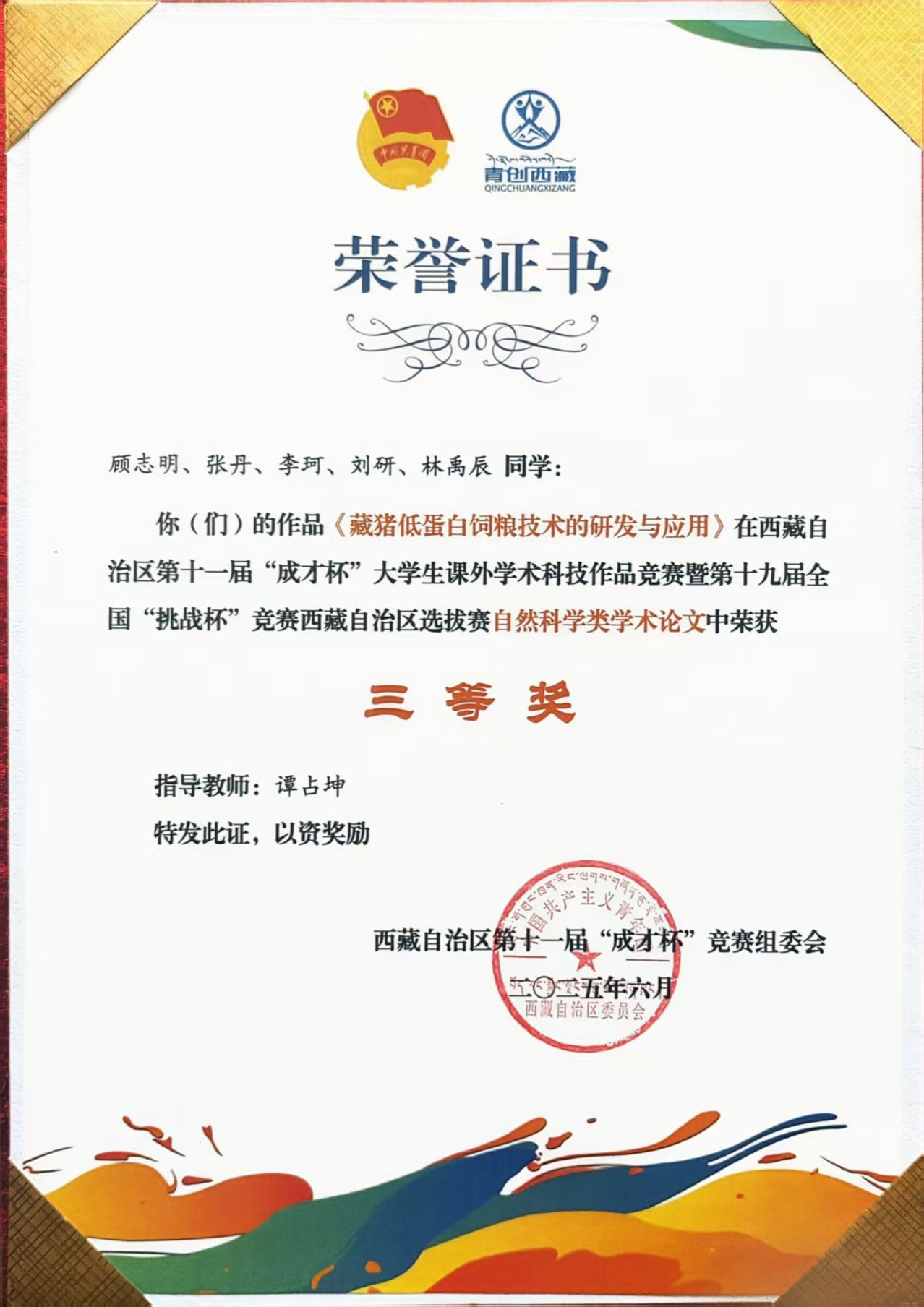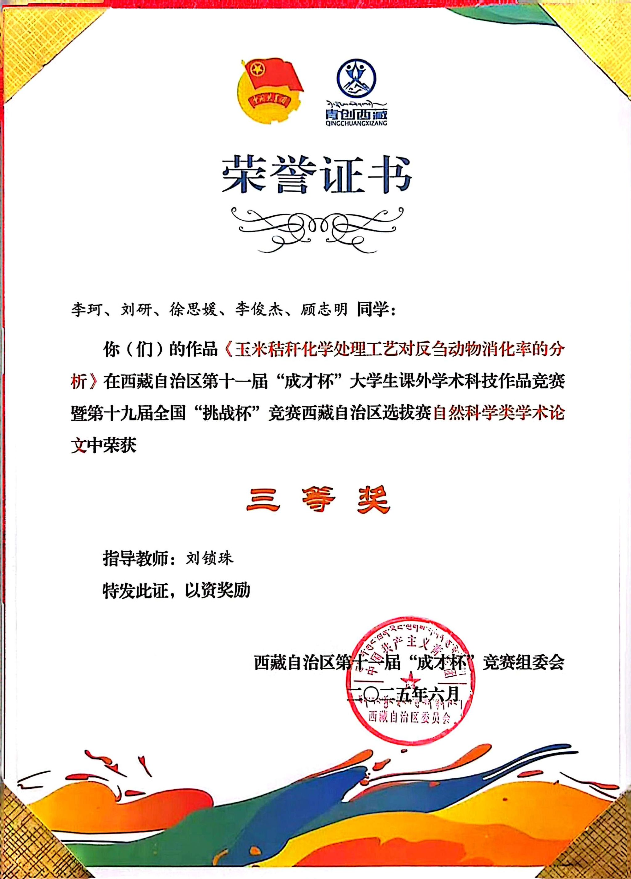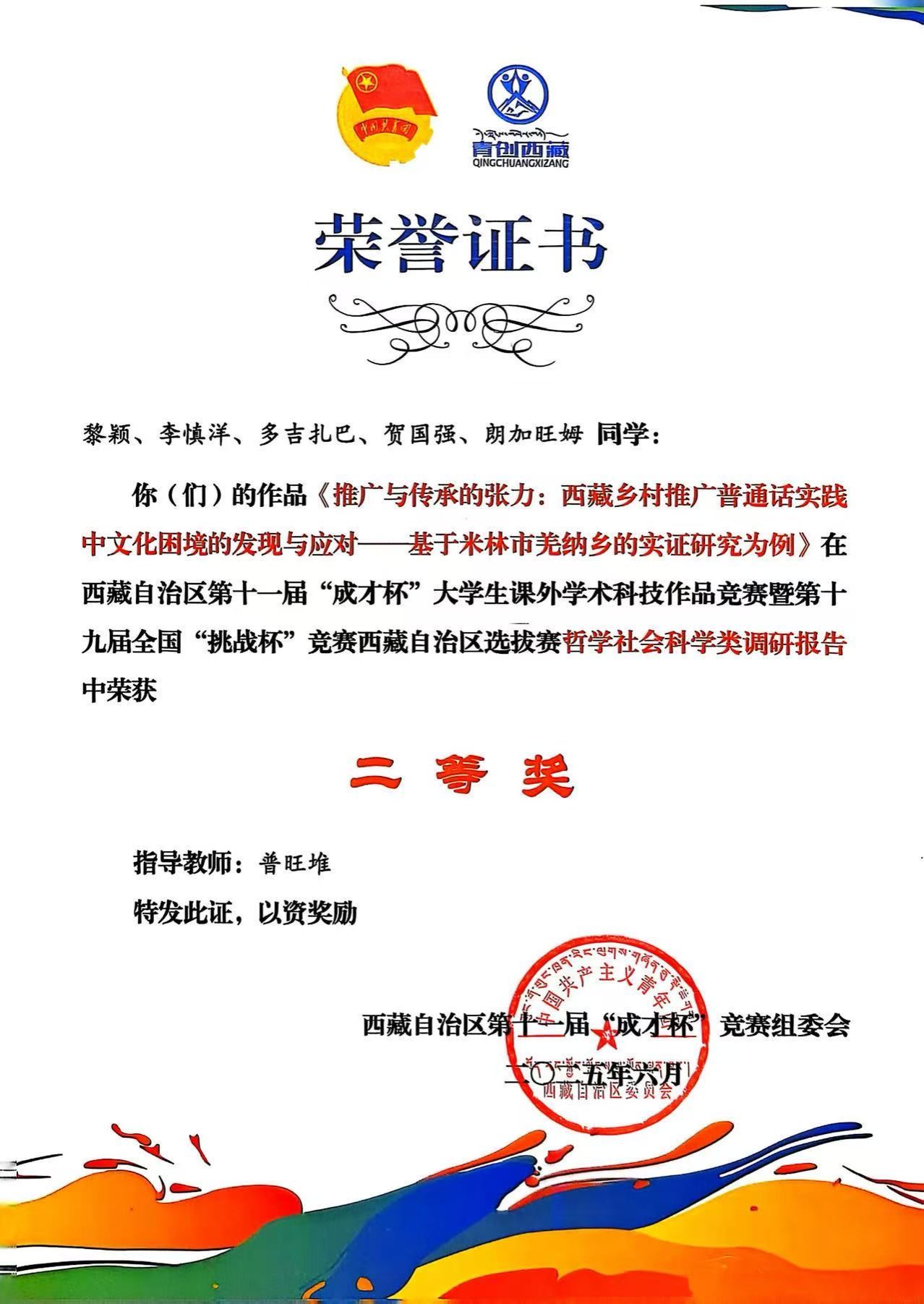 近日获悉,我校在西藏自治区第十一届“成才杯”大学生课外学术科技作品竞赛暨第十九届全国“挑战杯”竞赛西藏自治区选拔赛决赛中取得优异成绩!大赛由团西藏区委、区教育厅、区科技厅、区人社厅、区工商联、区科协、区社科院、区学联联合主办。在本次竞赛中,我校入围区赛的11个参赛团队凭借卓越的创新思维、扎实的专业知识和顽强的拼搏精神,共荣获优秀组织奖;自然科学类学术论文赛道二等奖1项、三等奖2项;科技发明制作赛道二等奖1项,三等奖1项;哲学社会科学类调研报告赛道二等奖1项;最终推荐4项作品进入国赛,展现了我校学子的卓越风采和创新实力。