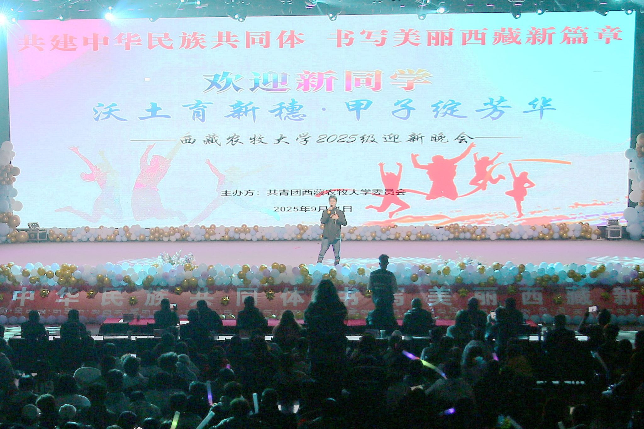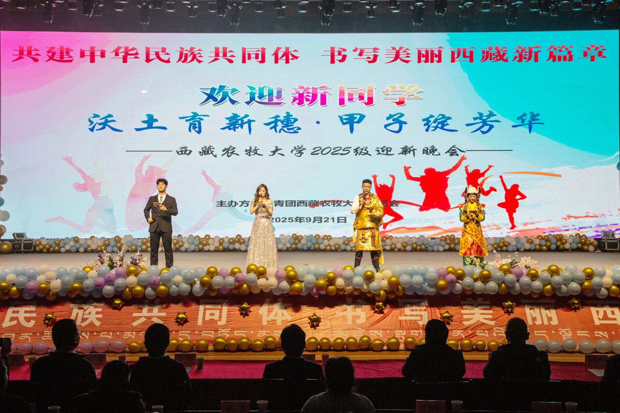 从青涩初创到甲子荣光,西藏农牧大学在雪域高原上书写着培育人才、助力西藏经济社会发展的动人故事;从五湖四海到农大校园,2025级新同学带着憧憬与热爱,即将在这里播撒梦想的种子。“沃土育新穗,甲子绽芳华”迎新晚会,是学校对新生的热烈欢迎,是过往与未来的深情对话,更是青春与梦想的华丽绽放。精彩的节目轮番上演,动人的旋律萦绕校园,校领导与师生们并肩而坐,在璀璨灯光下,一同欣赏精彩纷呈的节目,一同感受农大家庭的温暖,让新同学在欢声笑语中更快融入校园,开启一段与农大共成长的美好旅程!