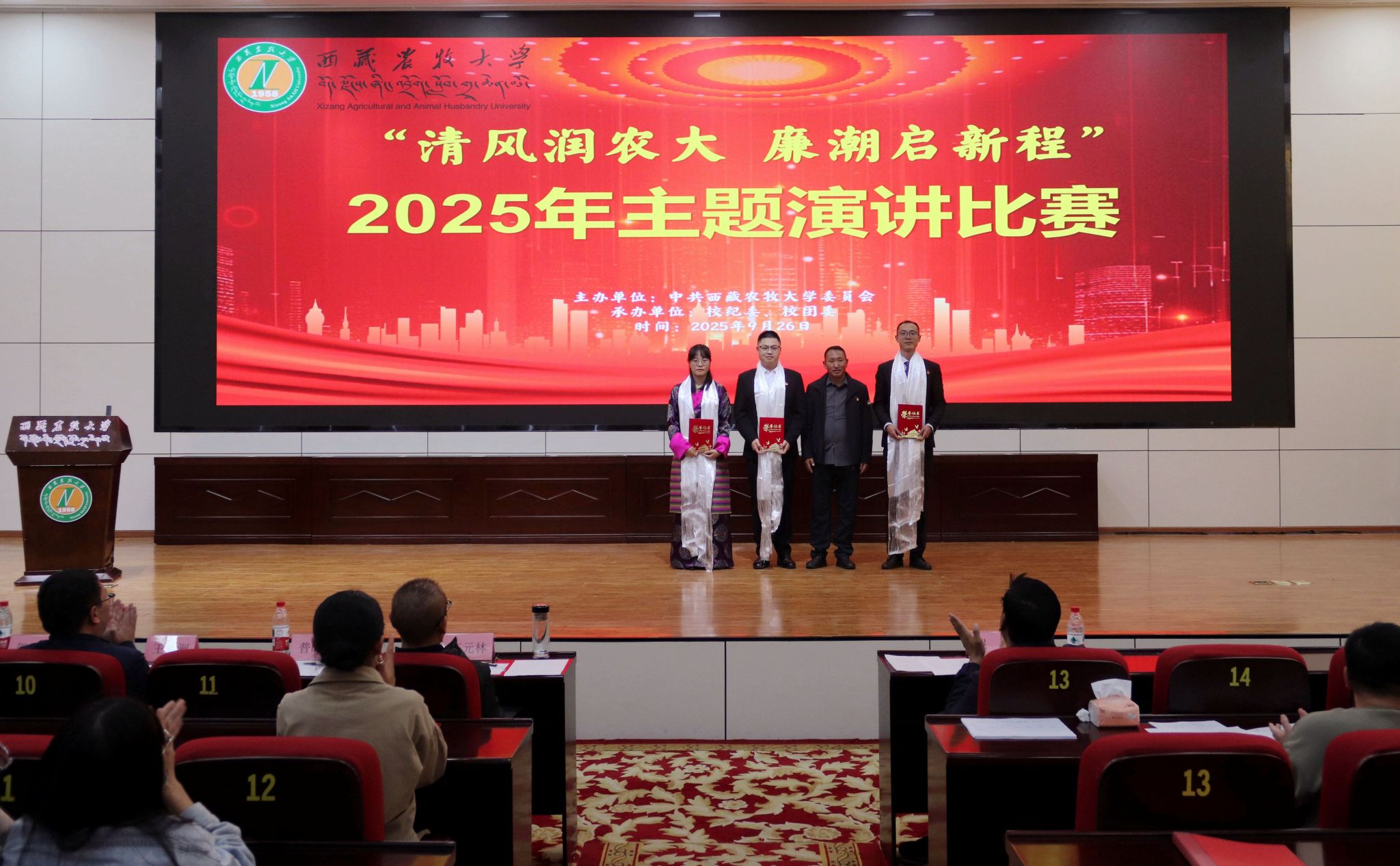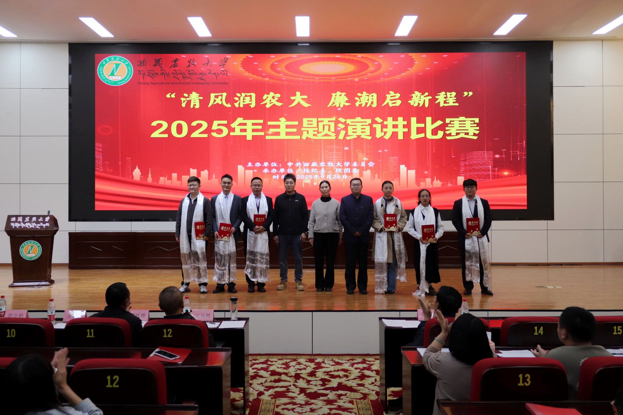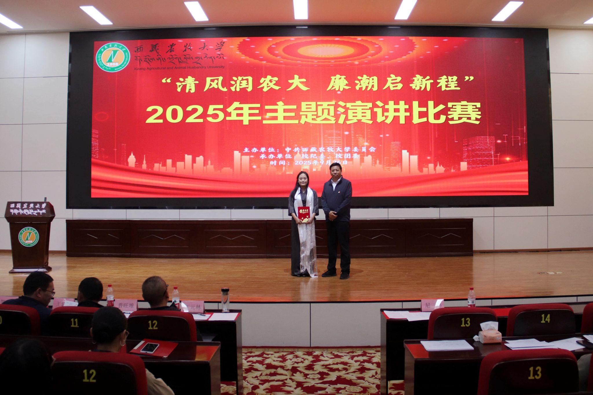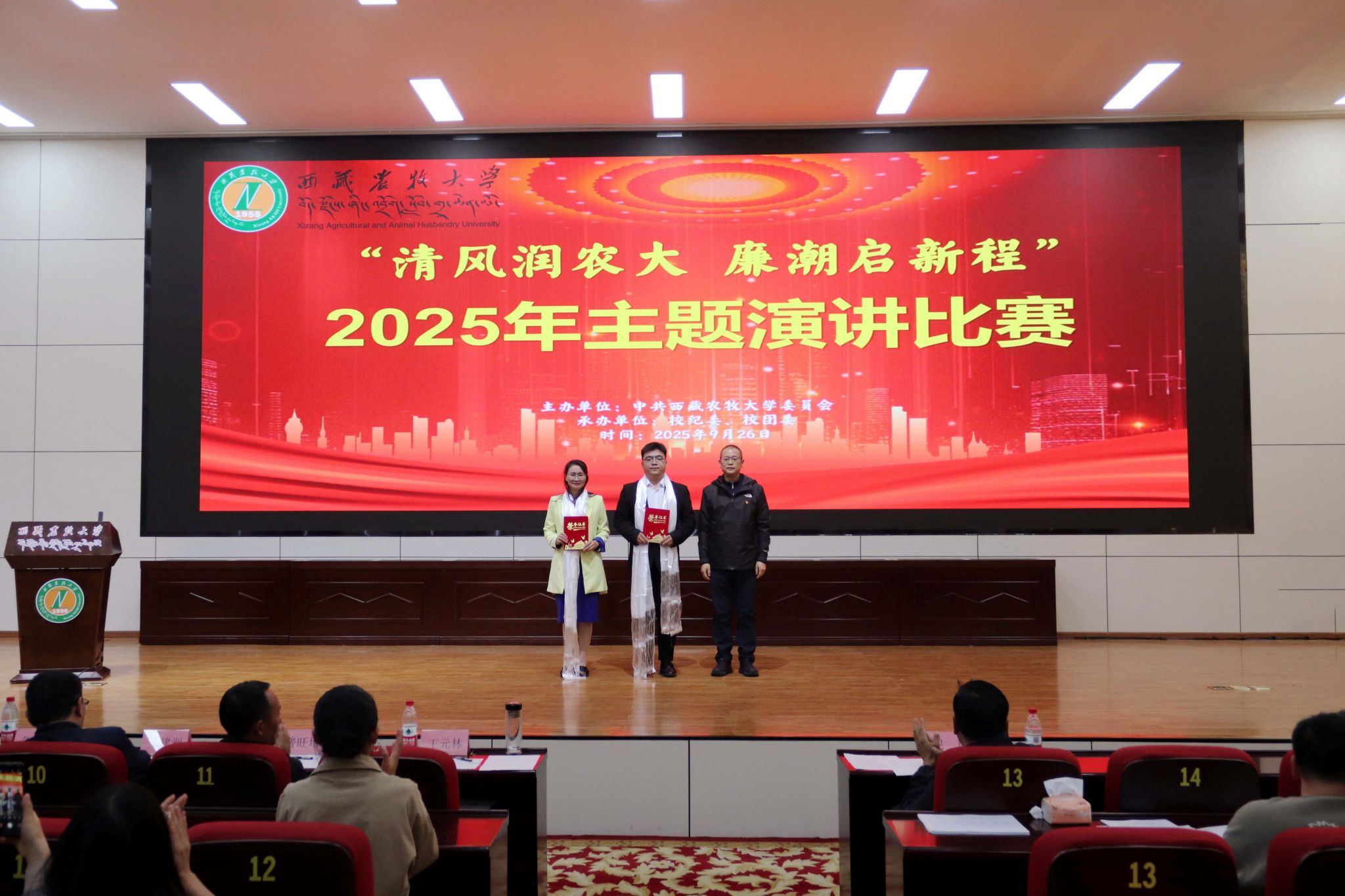 为扎实推进校园廉洁文化建设,营造风清气正的育人环境,引导广大师生筑牢拒腐防变的思想道德防线,按照学校党风廉政建设宣传教育月活动安排,2025年9月26日下午,西藏农牧大学党委主办,校纪委、校团委承办的“清风润农大,廉潮启新程”主题演讲比赛顺利举行。校党委委员、纪委书记尼玛出席活动,各二级党组织师生代表近210人观看了比赛,各二级学院、各职能部门13名教职工参加比赛。