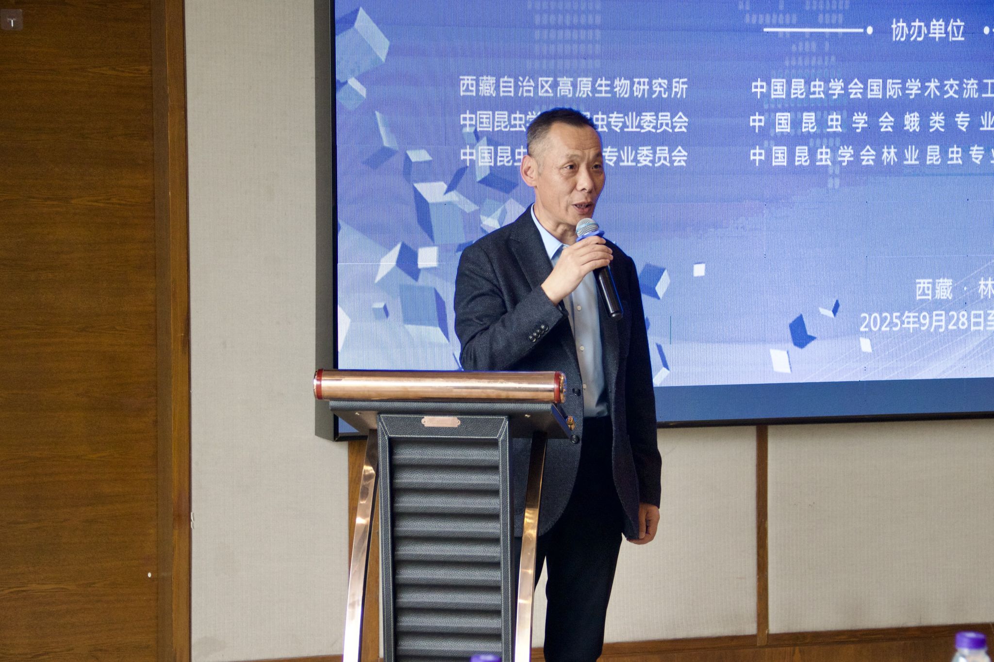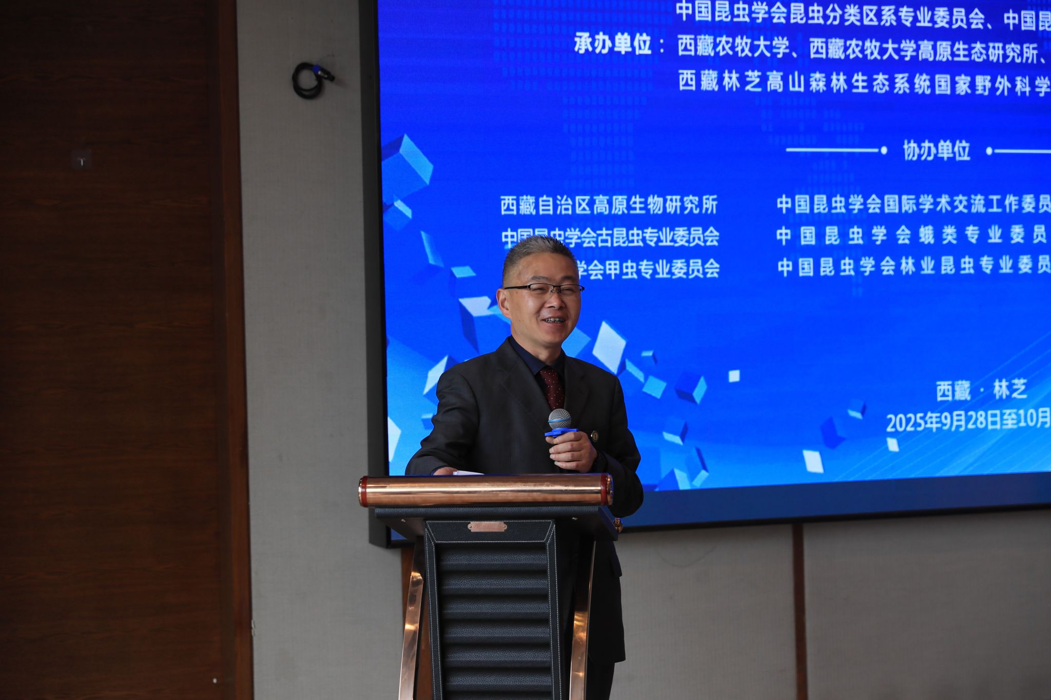 中国昆虫学会青年工作委员会主任、中国科学院动物研究所研究员王宪辉研究员主持。西藏农牧大学副校长邢震教授代表承办单位致开幕词,邢震在致辞中表达了对学术研讨会的召开表示热烈祝贺,并指出:西藏作为全球生物多样性热点地区,其独特的高原环境孕育了丰富的昆虫资源,此次研讨会宗旨和内容与我校林学、生态、植保三大核心学科发展密切相关;希望此次会议能够深化昆虫与高原生态系统互作机制探索、能够助力构建高原特色作物绿色防控体系。他介绍了西藏农牧大学的概况,表达了与各位专家深化合作的愿望,并预祝会议圆满成功。罗大庆所长在致辞中表达了对全国昆虫学界的专家学者来到林芝参会表示热烈欢迎,并对中国昆虫学会将此次重要会议安排在林芝表示感谢,指出当前西藏的科研趋势良好,科研经费持续增长,体现了国家对西藏发展的高度重视,一系列重大工程的建设都离不开生态保护工作,这为学者们提供了广阔的合作机遇。他诚挚邀请各位学者能与西藏本地团队合作,共同推动西藏昆虫生物多样性的保护与利用研究。