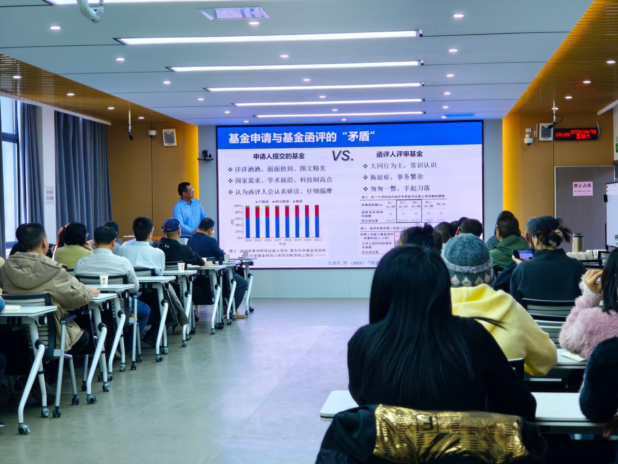 随后,袁巍以“青椒视角下国家基金写作的‘法’与‘术’”为题,系统解读了基金委最新政策、申报指南、资助方向与评审标准,现场拆解了优秀申报案例,帮助我校科技人员迅速厘清撰写思路。