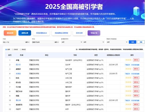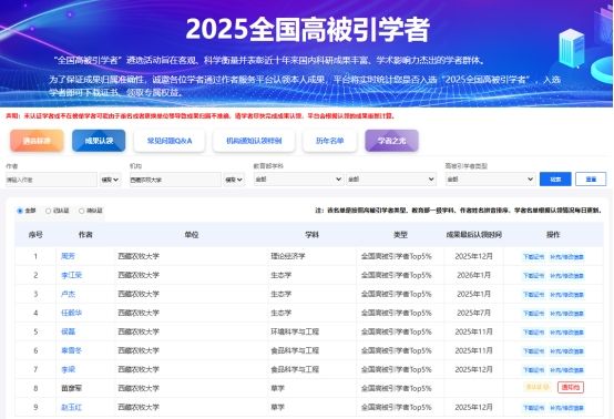 近日,中国知网中国科学文献计量评价研究中心正式发布《2025全国高被引学者》名单,我校李江荣等31名学者凭借其在所属学科领域的突出学术贡献,入选“全国高被引学者Top5%”。