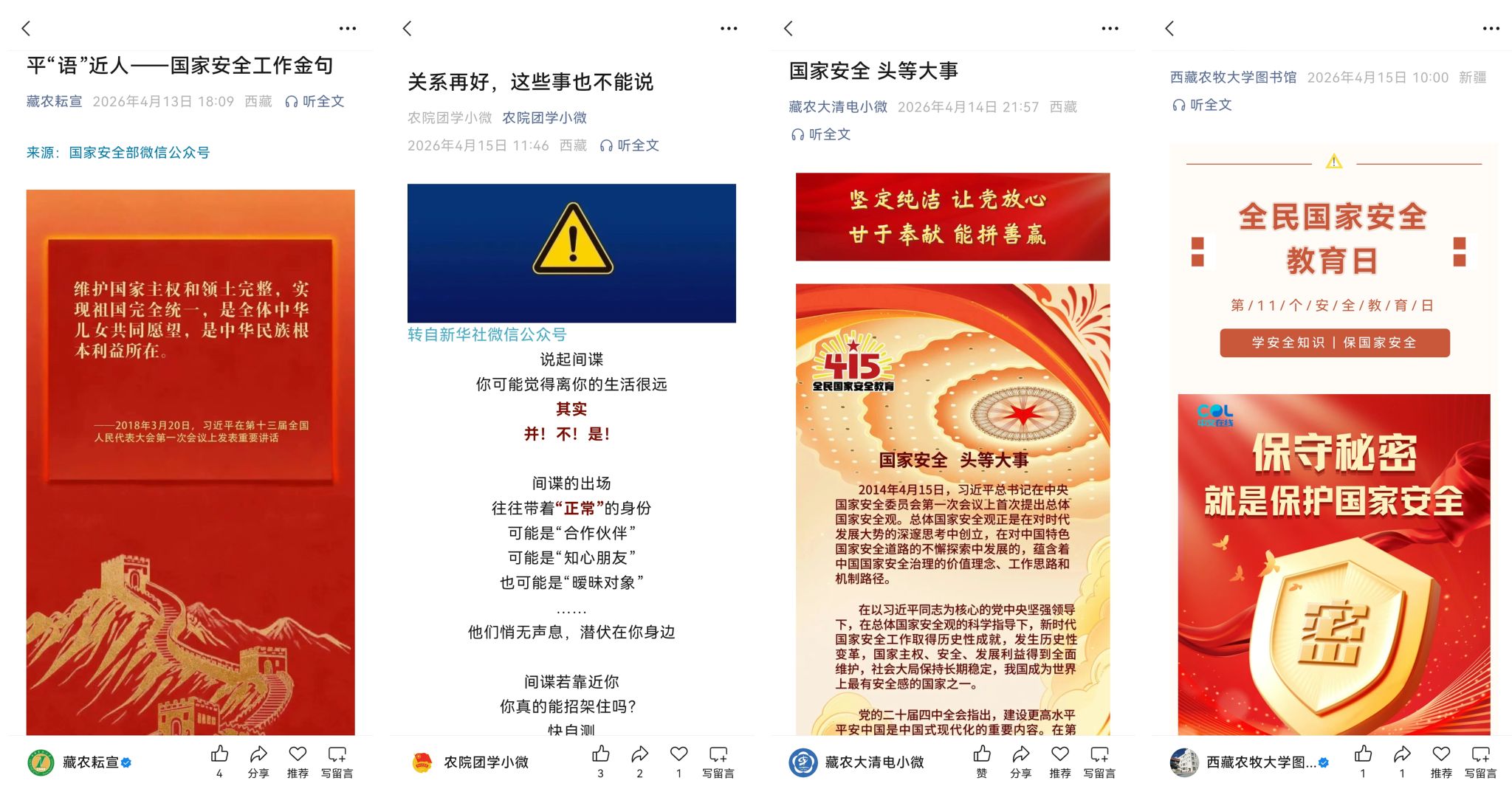 今年是习近平总书记提出总体国家安全观12周年,4月15日是第11个全民国家安全教育日,为深入贯彻落实习近平总书记关于加强国家安全教育的重要指示批示精神,根据自治区依法治藏办、教育厅相关工作部署和要求,近期,西藏农牧大学围绕“统筹发展和安全 护航‘十五五’新征程”这一主题,紧密结合学校实际,以多形式多渠道深入开展国家安全宣传教育系列活动。