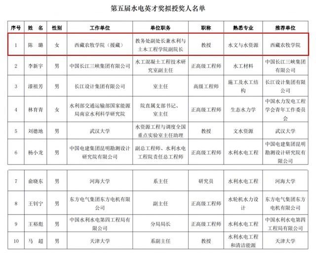 近日,中国水力发电工程学会公布了《关于第五届水电英才奖奖励的决定》,经过初评、函评、会评三轮数十名院士、专家的评审,我校水利土木工程学院陈璐教授获此殊荣。陈璐教授是华中科技大学选派的中组部第十批援藏干部,目前任我校教务处副处长兼水利与土木工程学院副院长。