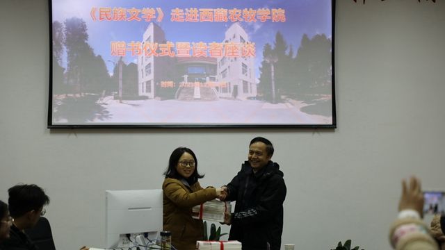 12月13日,《民族文学》编辑部主编石一宁、副主编杨玉梅和中国传媒大学人文学院院长张晶等一行7人到我校图书馆开展了书刊捐赠暨读者交流座谈。西藏农牧学院党委委员、副校长巩同梁,林芝市文联副主席次仁,图书馆馆长张宏伟、副馆长唐兰及相关工作人员等参加了此次捐赠交流座谈会。会议由馆长张宏伟主持。