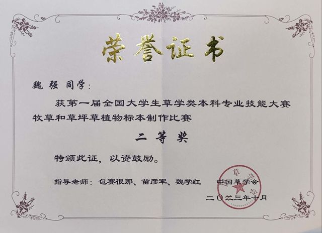 本次大赛由中国草学会主办,甘肃农业大学草业学院、兰州农业大学草地农业科技学院和中国草学会教育专业委员会承办,新疆农业大学协办,教育部高等学校草学类专业教学指导委员会学术指导开展的一次隆重的比赛,全国共计28所院校,112名草业科学专业的本科生参赛。经过紧张的备战,在草业教研室老师们的悉心指导下,参赛学生不断地操练和完善各项比赛细节,最终在师生的共同努力下,参赛学生2020级草业科学本科班的魏强同学荣获“牧草和草坪草植物标本制作”比赛二等奖以及团体三等奖的好成绩。