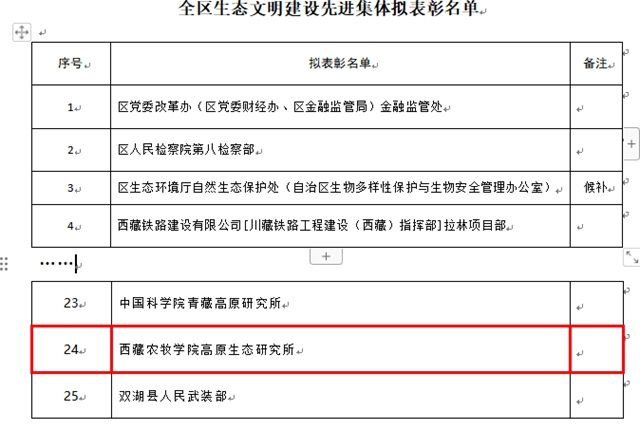 根据《关于印发〈全区生态文明建设先进集体和先进个人评选表彰工作方案〉的通知》(藏高地办发〔2022〕7号)精神,西藏农牧学院高原生态研究所被评为“全区生态文明建设先进集体”,这是对高原生态所积极践行生态文明建设的高度肯定。