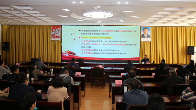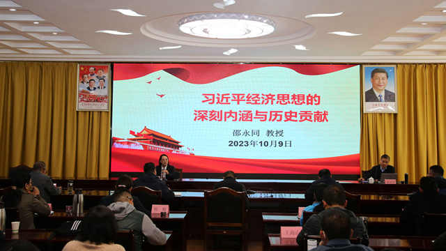 为持续深化理论武装,着力推动学习贯彻习近平新时代中国特色社会主义思想主题教育常态化、长效化,10月9日,我校邀请天津商业大学经济学院邵永同教授作题为《习近平经济思想的深刻内涵与历史贡献》的专题讲座。讲座由宣传部副部长、思想政治理论课教研室主任朱娅教授主持,各单位县处级领导、师生代表聆听了此次讲座。
