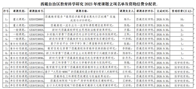 根据西藏自治区教育科学研究2023年度拟立项课题公示》,我校《西藏教育服务“高原经济高质量发展先行区创建”实施成效与评价研究》等15个课题获得西藏自治区教育厅立项,并对其中9项课题资助,资助经费达到30万元。此次获批项目中,重大课题2项,分别资助10万元,一般课题3项,分别资助2万元,青年专项课题4项,分别资助1万元,单位资助课题6项,由我校自行资助。这是我校自申报该课题以来获批立项资助项目数量最多的一次,也是我校继2020年时隔两年后再次获批的自治区教育科学研究重大课题立项资助。