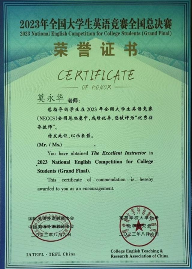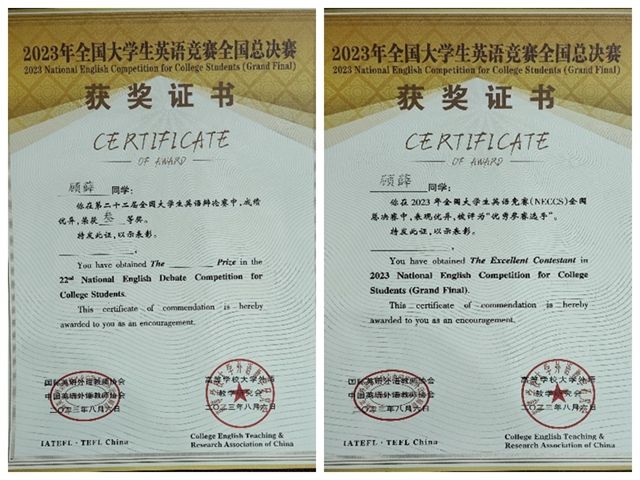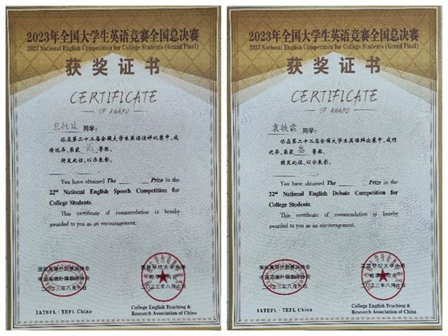 本届全国总决赛包括三大赛事:第二十二届全国大学生英语演讲比赛、第十五届全国大学生英语风采大赛以及第二十二届全国大学生英语辩论赛。袁轶霖同学在全国大学生英语演讲比赛中获得全国二等奖和第二十二届全国大学生英语辩论赛全国三等奖,顾薛同学获得英语辩论比赛全国三等奖奖项,并被评为优秀参赛选手。公共教学部英语教研室莫永华老师获得优秀指导教师称号。