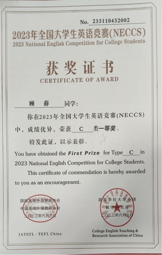 全国大学生英语竞赛旨在贯彻落实教育部关于大学英语教学改革和考试改革精神,激发广大学生学习英语的兴趣,促进大学生英语水平的全面提高,选拔并奖励大学英语学习成绩优秀的学生。该项赛事分为初赛、决赛和全国总决赛。近年来,在学校领导和各部门的大力支持下,大学英语教学质量稳步提升,学生也在全国性的英语学科竞赛中崭露头角,并获取了优异的成绩。