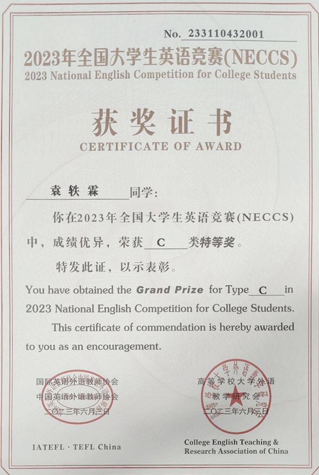 经过今年5月7日初赛的选拔和6月3日决赛的拼搏,最终经过全国大学生英语竞赛组委会认定,我校学生在2023年全国大学生英语竞赛中斩获全国特等奖1名,全国一等奖1名,全国二等奖2名,全国三等奖5名,还有12名同学荣获了校级一二三等奖。