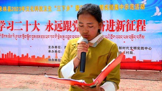 活动伊始,首先由县委常务副书记冯胜生致辞,充分阐释了在开局之年联合开展三下乡活动的重要意义,对青年学生和村民群众提出了殷切希望,对校地共同加强人才培养、服务地方经济社会发展提出了殷殷期望;罗晓莉宣讲了党的二十大精神、习近平新时代中国特色社会主义思想、“四件大事”和“四个创建”、建设农业强国等理论政策;大学生宣讲员卓嘎宣讲了生态环境建设、乡村振兴战略、“三农”工作、固边强边、民族团结等方面的理论政策。一个致辞、两场宣讲突出了铸牢中华民族共同体意识这条主线,凸显了学习宣传、贯彻落实党的二十大精神和习近平新时代中国特色社会主义思想的主题,引领广大村民群众和青年学生更加深刻领悟“两个确立”的决定性意义,更加深刻领悟习近平总书记关于教育工作、“三农”工作、生态文明建设、固边强边的重要论述,更加坚定紧跟党的心、人民领袖奋进新征程、师生群众建功新时代的决心与信心。
