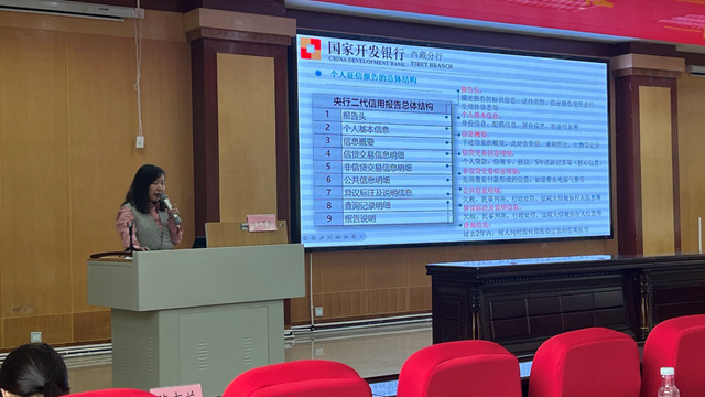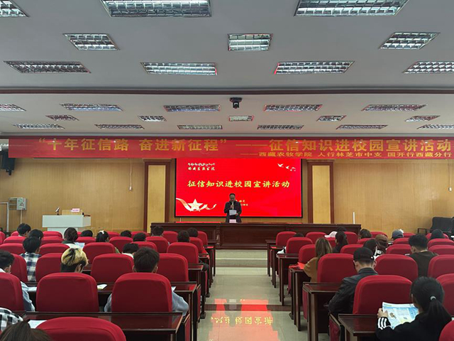 为贯彻落实党的二十大提出的“完善覆盖全学段学生资助体系”要求,进一步推进我院学生的诚信感恩教育,激发学生的诚信意识、感恩意识、责任意识和奉献意识,6月19日学生工作处邀请国家开发银行西藏自治区分行、中国人民银行林芝市中心支行相关工作人员,在研究生苑报告厅举行“十年征信路奋进新征程”征信知识进校园宣讲活动。活动由学生工作处处长赵德军主持,国开行信贷处边巴普珍、客户二处贺珍妮分别作报告。学工处、二级学院辅导员和100余名同学参加活动。