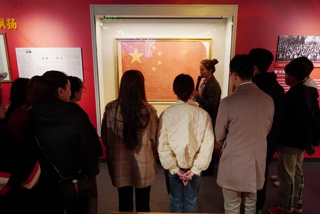 在讲解员的带领下,研学团师生学习了解村党支部老书记旺久“一面红旗”的故事。这面已然泛白的国旗,是立定村村党支部老书记旺久带着当时村里的党员亲手缝制的,如今已在立定村传承了63年。旗面泛白的红,淡淡的五星,缺失的旗角透露着着一种不可言语的历史厚重感,其背后是中国共产党人在这片土地上奋斗终身的动人故事,也是一代又一代传承不息的家国情怀。