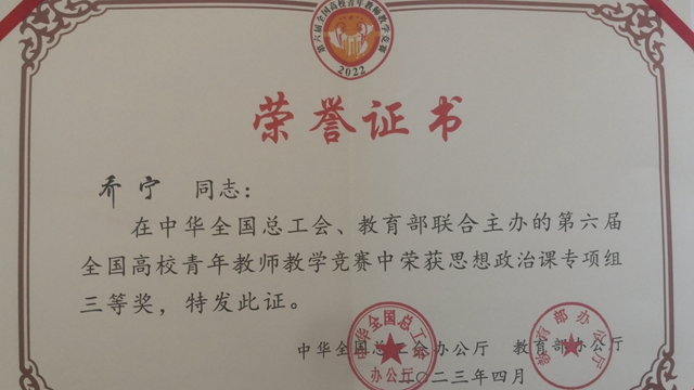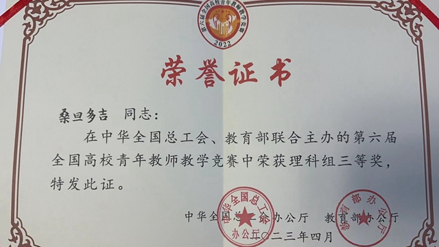 2023年4月20至24日,由全国总工会、教育部联合主办的第六届全国高校青年教师教学竞赛决赛在清华大学成功举办,竞赛设文科、理科、工科、医科、思政课专项五个组别,以“上好一门课”为理念,来自31个省(区、市)和新疆建设兵团的121所高校的158名选手参加了决赛。乔宁和桑旦多吉老师分别作为西藏代表队思想政治课专项组和理科组选手,与来自31个省市的优秀青年教师同组竞技,激烈角逐,经过教学设计、课程教学和教学反思三个环节的激烈比拼,乔宁老师获得了思想政治课专项组三等奖,桑旦多吉老师获得理科组三等奖。