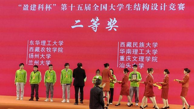 2023年3月23日—26日,第十五届全国大学生结构设计竞赛在太原理工大学举行。经现场模型制作、陈述答辩、加载测试等环节激烈比拼,我校“南迦巴瓦”代表队获得第十五届全国大学生结构设计竞赛二等奖。2022年7月由于我校成功举办了西藏自治区分区赛,我校还被授予第十五届全国大学生结构设计竞赛“优秀组织奖”。