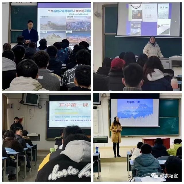 丰富内容,精心组织。本学期“开学第一课”聚焦学习宣传贯彻落实党的二十大精神这一首要政治任务,围绕“思想政治教育、身心健康教育、校规校纪及各类安全教育”等三个方面展开。各科任课教师立足本课程实际,结合青年学生特点和相关内容,自行确定教学方式方法,利用各门课程的前5分钟时间向学生进行讲授。“开学第一课”的滴灌式、融汇式教育持续推进了以党史为重点的“五史”学习教育、中华民族共同体意识教育、民族团结进步和反分裂斗争教育、爱国兴藏和强农兴农教育常态化长效化,通过课堂的正面宣传引导,帮助学生进一步坚定理想信念,在重大是非问题上头脑清醒,在风浪考验面前无所畏惧,在机遇与挑战中厚植家国情怀。同时,通过宣传各类先进模范事迹,深化精神文明教育,倡导文明守法、积极健康的学习生活方式,引导青年学生制定科学合理的学习规划、养成良好的言行举止、增强各类安全意识,共同营造安全和谐美丽的校园环境。