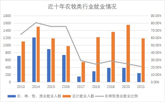 2013年-2021年期间,学校共计培养13367人毕业生,共计就业人数10672,其中农、林、牧、渔业就业人数5543人,农、林、牧、渔业就业人数占就业毕业生人数的47.53%。