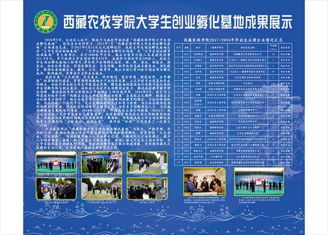 专业与特长相结合的优秀创业项目。截至目前,学校大学生创业孵化基地累计15个项目成功孵化,15名学生实现成功自主创业。40余名毕业生成功注册企业,真正实现自主创业就业。创业大学生中,以林学2015级本科班学生石利刚为代表,于2018年成功注册个人企业“西藏萨托农业科技有限公司”,企业注册资本已达300万元;以草业科学2013级本科班学生贡桑群培为代表,于2017年创办西藏暾博文化有限责任公司,企业注册资本已达100万元,并带动多名大学生就业。