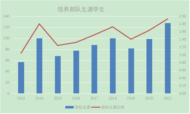 2013~2021年共有166名学生投身军营报效祖国,学校普招培养了802名部队生源,每年部队生源比例保持在1%-2%之间。目前,部队生源就业主要服务西藏基层一线,部分学生更是充实到了边境乡镇各条战线上,该类生源因思想过硬、政治过硬、身体过硬、素质过硬,为西藏自治区民族团结工作和固边兴边强边富民发挥了重要作用。