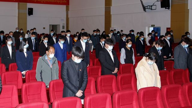 人民大会堂与会人员为已故老一辈无产阶级革命家和革命先烈默哀时,师生站立肃穆,在默哀致敬中凝聚踔厉奋发新征程、勇毅前行向未来的强大力量。