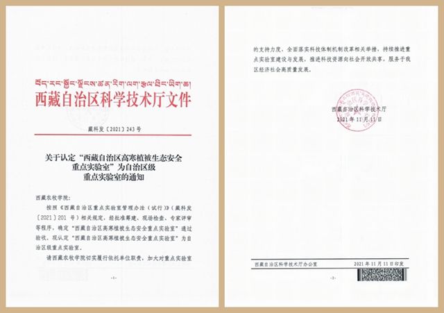 (3)秉承“搭建西藏生态安全公共开放式平台,构建生态安全预警与决策支持体系,集成生态安全保护与修复技术,培养吸收高水平人才,加强高原生态学科创新能力建设”的建设目标和“坚持联合开放、坚持科技创新、坚守西藏特色资源”的建设原则,以西藏高寒生态系统为核心,建成西藏自治区高寒植被生态安全重点实验室,于2021年11月获批为自治区级重点实验室。
