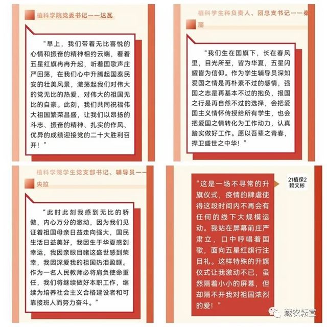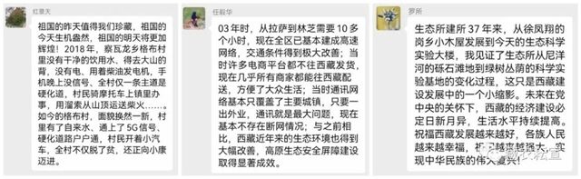 高原生态研究所组织教工开展线上与国旗合影活动,并在微信工作群组织了“讲共和国故事、谈身边发展变化”主题讨论,老师们讲述了共和国故事,谈到中国从积贫积弱、满目疮痍、百废待兴的落后国家,如今建设成了一个团结统一、繁荣富强、生机勃勃的新兴大国,谱写了中华民族和人类发展史上的光辉篇章。老师们谈身边发展变化,谈到刚参加工作时迈入西藏农牧学院的场景,经过一代代农院人不懈的努力,如今的农院改变了昔日的旧貌,整个校园充满了生机!谈到西藏交通事业,拉林铁路通车、川藏铁路开工、派墨公路通车,每一项工程都是世纪工程,让大家真真切切感受到了西藏的繁荣发展。