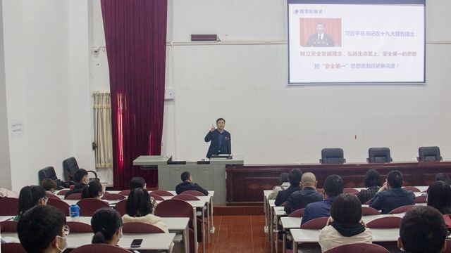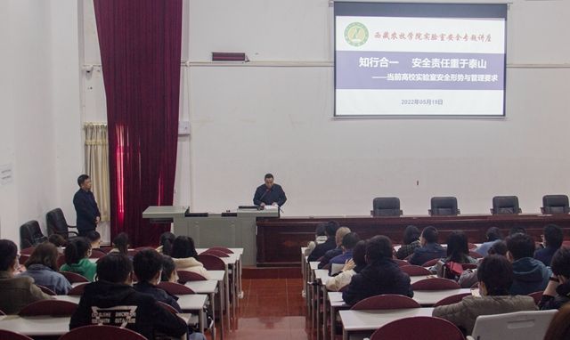 为深入贯彻落实4月4日学校关于实验室安全工作专题会议精神;落实学校4月29日提出的“提高政治站位,思想上充分认识安全生产的重要性;加强实验室日常管理;强化相关工作人员技能培训;重点整改部位立行立改”四点意见指示精神;落实林芝市公安局禁毒大队5月17日关于做好“易制毒”化学品和麻醉药品管理工作联调会议精神;落实教育部科技与信息化司、高教司2022年高校实验室安全培训会议精神;落实《教育部办公厅关于开展加强高校实验室安全专项行动通知》精神,切实增强实验人员安全责任意识,提升实验室安全管理水平,2022年5月19日下午,教务处在2107教室成功举办主题为“知行合一,安全责任重于泰山——当前高校实验室安全形势与管理要求”的实验室安全知识专题讲座。本次安全培训工作得到学校党委行政高度重视,校党委书记云旦加措在培训前对如何做好此次培训工作提出了新思路、新要求并做出了相关指示。