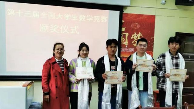 西藏农牧学院8名学生在第十三届全国大学生数学竞赛赛区赛获得优异成绩。5月13日上午公共教学部数学教研室教师敬久旺、洛桑和刘秀丽在公共教学部会议室为获奖学生举办了颁奖仪式。