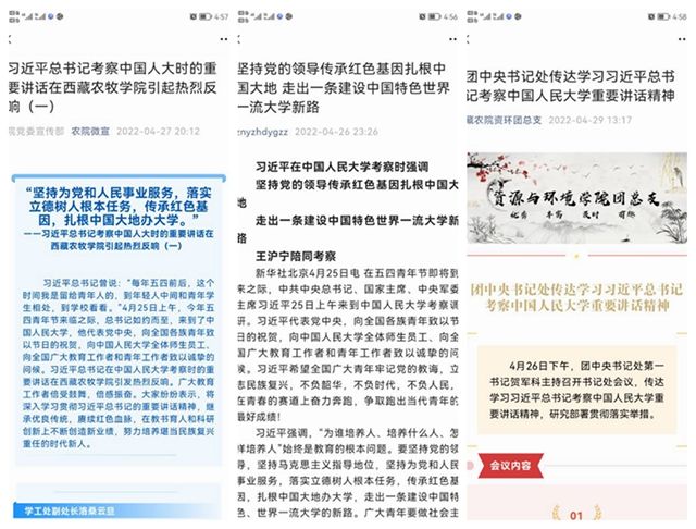 学习迅速、反响热烈,全校兴起学习宣传贯彻习近平总书记重要讲话精神热潮。各级党团学组织把学习贯彻习近平总书记在中国人民大学考察调研时的重要讲话精神作为当前一项重大政治任务,迅速铺开各级学习教育活动。在学校层面,第一时间召开了学校党委理论中心组专题学习会、团学干部师生座谈交流会、思想政治理论教师集体研讨会等学习交流活动;在二级单位层面,各级党团学组织积极响应,通过“三会一课”、科室教研室活动、年级班级主题教育等形式,及时传达学习习近平总书记重要讲话精神和学校党委关于学习宣传贯彻习近平总书记重要讲话精神有关部署要求,组织干部师生进行热议讨论。学校各级领导干部切实做好示范引领,带头真学深悟,带头谈体会、写感想,带领广大师生把思想行动统一到总书记的重要讲话精神上来,从习近平总书记内涵丰富、思想深邃、情真意切、语重心长的讲话中,汲取思想养分和精神力量。据不完全统计,全校各单位已开展学习交流活动120余场次,师生撰写心得体会370余篇。学校各级各类媒体积极转发转载习近平总书记在中国人民大学考察调研的相关报道和重要讲话内容,大力宣传学习交流活动情况和师生心得体会等,1篇优秀感想被西藏日报采用,营造了浓厚学习宣传氛围。通过学习,广大干部职工纷纷表示要坚持为党和人民事业服务,传承红色基因,继承优良传统,立足本职岗位,在教书育人、科研创新、管理服务上不断创造新业绩,更好地落实立德树人根本任务,努力培养堪当民族复兴重任的时代新人。广大青年学生表示要牢记党的教诲,牢记习近平总书记的殷殷嘱托,立志民族复兴,不负韶华,不负时代,努力学习科学文化知识,增强责任担当本领,在青春的赛道上奋力奔跑,争取跑出当代青年的最好成绩。