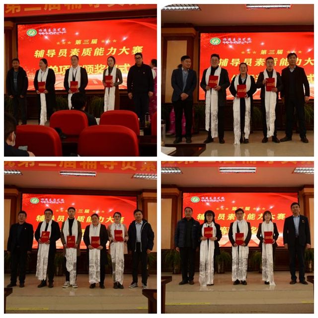 随着各位辅导员谈话结束,西藏农牧学院第三届辅导员素质能力大赛也逐渐落下帷幕。经过激烈的角逐,来自动物科学学院的王倩倩、电气工程学院的陈相宇及水利土木工程学院的孙凤荣分别获得初赛、复赛及决赛的单项奖;植物科学学院秦丽、动物科学学院王浩然、水利土木工程学院续辉获得优秀奖;植物科学学院王兵、水利土木工程学院孙凤荣、动物科学学院殷巧、食品科学学院马少飞获得三等奖;动物科学学院梁金辉、动物科学学院姚梦捷、植物科学学院央拉获得二等奖;动物科学学院王倩倩、电气工程学院陈相宇获得一等奖。