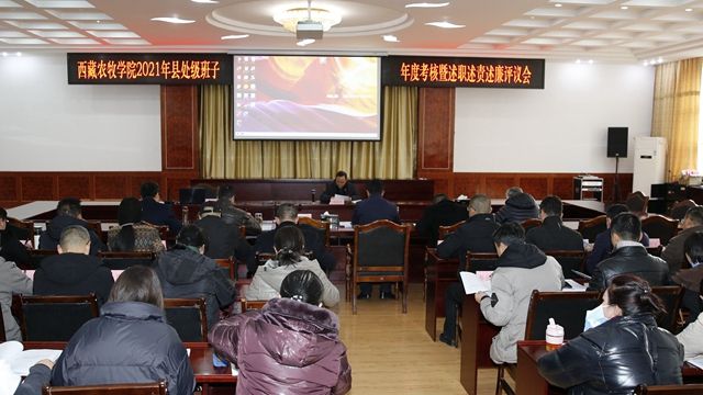 2021年12月15日,西藏农牧学院召开县处级领导班子年度考核暨述职述责述廉考核评议会。会议由学院党委副书记、院长娄源冰主持。学院党委书记、副院长云丹加措,学院副院长郑维列,学院党委委员、副院长郭永刚,学院党委委员、纪委书记边巴次仁,院长助理冯建刚,全院县处级单位主要负责同志及教职工代表共计56人参加会议。