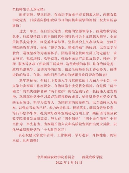 西藏农牧学院党委、行政向全校师生员工及家属拜年
