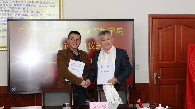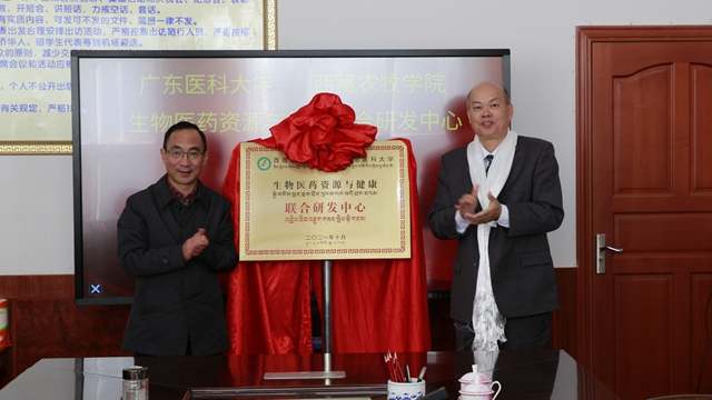 罗辉与郑维列分别代表两校签订了《广东医科大学——西藏农牧学院对口合作协议》。娄源冰与卢景辉为“生物医药资源与健康联合研发中心”揭牌。
