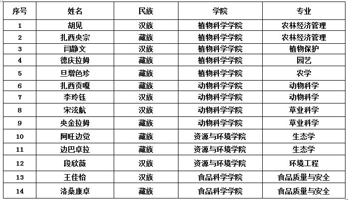 在各教学单位遴选推荐的基础上,经教务处审核、学校遴选工作领导小组研究,扎西央宗等14名学生政治合格、成绩优异,决定推荐为我校2021年中国农业大学联合培养生,其中藏族学生8人,占推荐人选的57%以上。