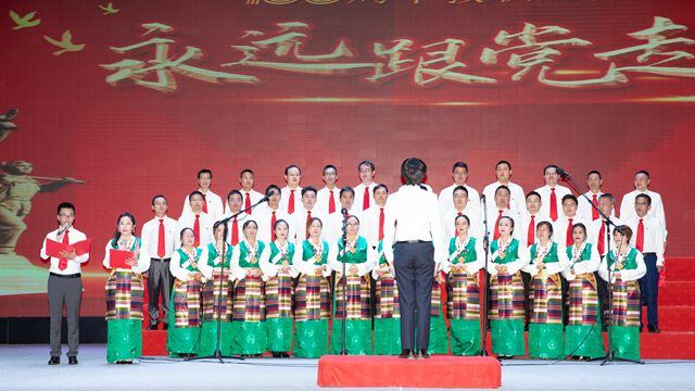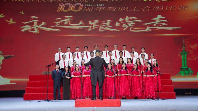 在中国共产党成立100周年之际,为隆重庆祝党的生日,热情讴歌中国共产党领导中国革命和建设取得的伟大成就,展示西藏农牧学院教职员工热爱党、心向党、跟党走的热情和坚定信念,6月29日晚,西藏农牧学院教育工会举办了“永远跟党走,奋斗新征程”庆祝建党100周年教职员工合唱比赛。校领导云丹加措、娄源冰、王从严、郑维列、边巴次仁,校长助理冯建刚出席比赛现场。