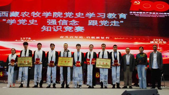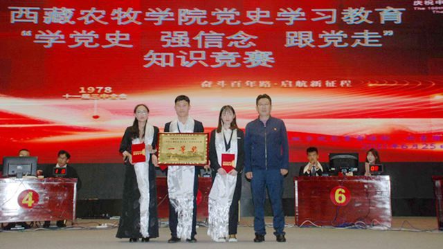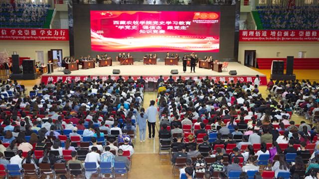 为庆祝中国共产党成立100周年,深情回顾党的光辉历程,热情讴歌党的丰功伟绩,同时推动党史学习教育高标准高质量开展,引导青年学子继承和发扬党的光荣传统和优良作风,西藏农牧学院于2021年6月25日下午在文体馆举办党史学习教育“学党史、强信念、跟党走”知识竞赛。学院党委副书记、副院长王从严,党委宣传部部长巴桑次仁、学生工作处处长赵德军、研究生处副处长陈凯旋、团委副书记普旺堆、思政教研室贺贤春教授,各二级学院(部、所)相关领导及3000多名学生参加了本次活动。