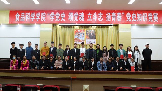 为迎接建党100周年,学习宣传党史知识,教育引导广大师生铭记党的历史,传承党的光荣传统,继承和发扬党的优良作风,立志做担当民族复兴大任的时代新人。食品学院党委于2021年5月28日15:30在行政楼会议室举办“学党史 颂党魂 立斗志 扬青春”主题党史知识竞赛决赛。会议特邀思想政治教研室贺会勤副教授、赵丹老师,食品科学学院索朗才旺书记和次仁措老师担任评委,食品学院全体师生参会活动。