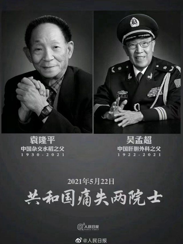 5月22日,中国工程院院士袁隆平,因多器官功能衰竭,在长沙逝世,享年91岁;中国科学院院士吴孟超因病医治无效,在上海逝世,享年99岁。人们为两位院士逝去而悲恸,深情缅怀两位杰出的科学家。