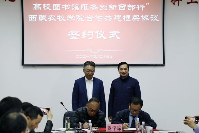 之后,在王从严副书记、陈建龙主任见证下,四川大学图书馆馆长党跃武代表共建高校图书馆与西藏农牧学院图书馆馆长张宏伟签订了《“高校图书馆服务创新西部行”西藏农牧学院合作共建框架协议》。