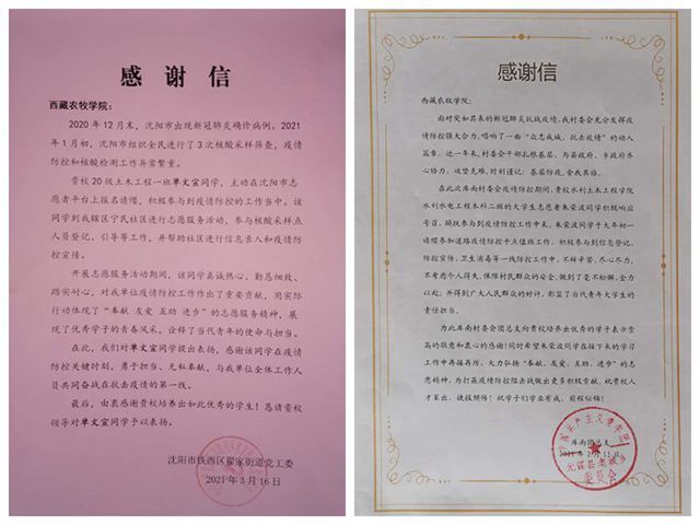 近日,我校团委收到沈阳市铁西区翟家街道党工委和共青团元谋县老城乡委员会感谢信,信件对我校土木工程2020级本科1班单文宣同学、水利水电工程2019级本科2班朱荣波同学的防疫志愿行为表示肯定和感谢,同时对我校培养出有社会责任感、能担当、勇作为的优秀学子表示敬意和赞扬。