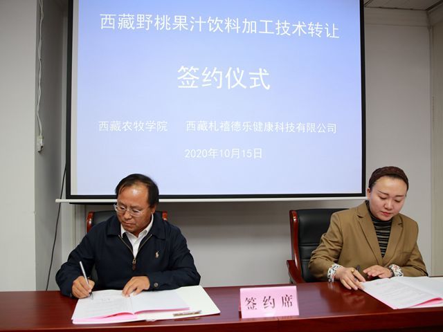 10月15日下午,西藏野桃果汁饮料生产技术转让签约仪式在林芝市政府举行,林芝市政府副市长徐龙海、校党委副书记、副院长王从严出席会议。