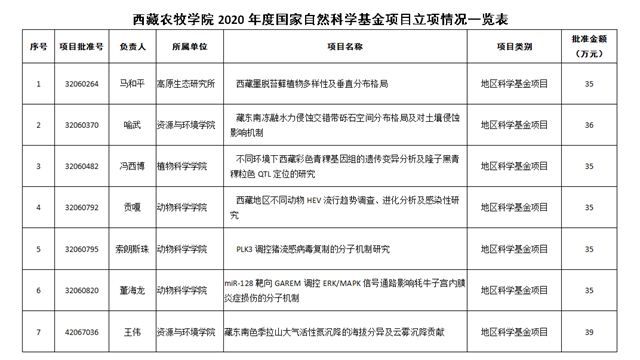 获得资助的7个项目均为地区科学基金项目,其中动物科学学院获批3项,直接经费共计105万元;资源与环境学院获批2项,直接经费75万元;高原生态研究所获批1项,直接经费共计35万元;植物科学学院获批1项,直接经费35万元。