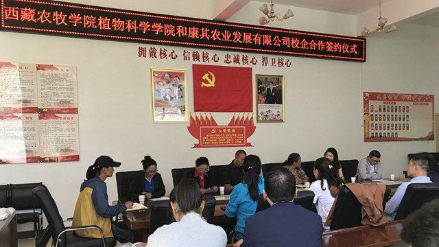 值此金秋时节,中央第七次西藏工作座谈会精神的号召下,为加强高校与企业间的协作,发展产学融合、协同育人的教育模式,促进高等教育与企业的共同发展,于2020年9月2日,西藏农牧学院植物科学学院与康其农业发展有限公司签订了校企合作协议。康其农业发展有限公司董事长朱林、总经理张岱,植物科学学院党委书记次仁吉、党委副书记院长旺姆、副院长次仁央金以及学院副高级以上老师出席了本次会议。
