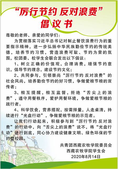 “一粥一饭,当思来处不易;半丝半缕,恒念物力维艰” 近日,习近平总书记关于制止餐饮浪费行为的重要指示在西藏农牧学院引起强烈反响,学校各单位结合实际,通过加强宣传教育、加强食堂管理、加强督促检查等,着力推动习近平总书记重要指示落到实处,教育引导广大师生树立正确的生活观、理性的消费观,杜绝“舌尖上的浪费”,努力营造浪费可耻、节约为荣的浓厚氛围。
