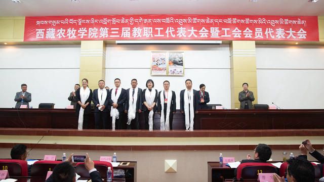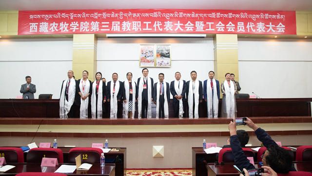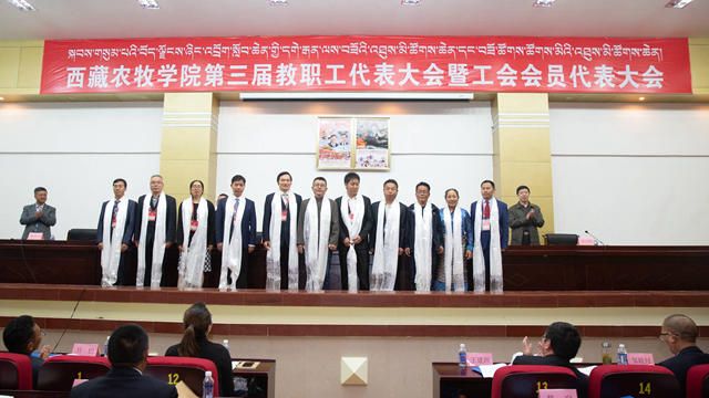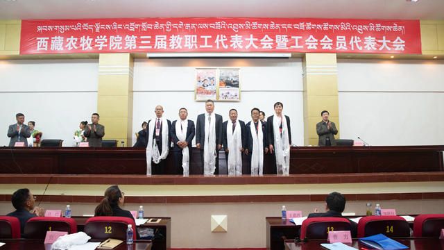 闭幕式上,学校领导向新一届当选委员献哈达、表祝贺。