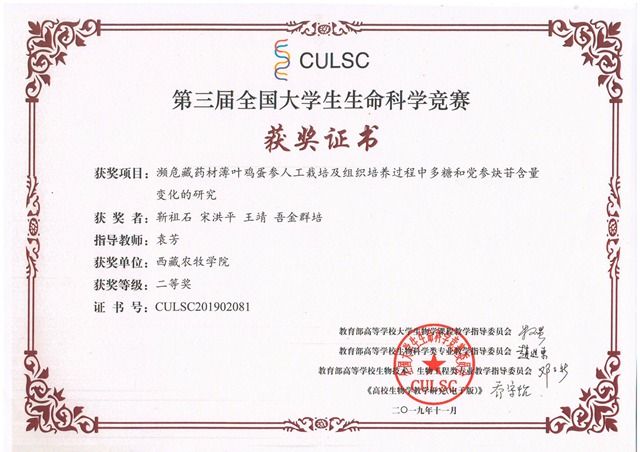 3、药材鸡蛋参丰产栽培技术试验示范及推广 食品科学学院袁芳讲师主持的《藏药材鸡蛋参丰产栽培技术试验示范及推广》,项目经费10万元,该项目开展了薄叶鸡蛋参种苗繁育研究、生长习性观察、生长发育规律研究及丰产栽培技术研究,研究结果表明薄叶鸡蛋参种子出苗率比对照组提高近一倍,采用间套种植方式下,薄叶鸡蛋参块根亩产量达到90 kg,比对照提高近50 kg,当归亩产量为29 kg;发表论文3篇,指导3名本科生毕业论文,指导本科生参加第三届全国大学生生命科学竞赛荣获二等奖一项。